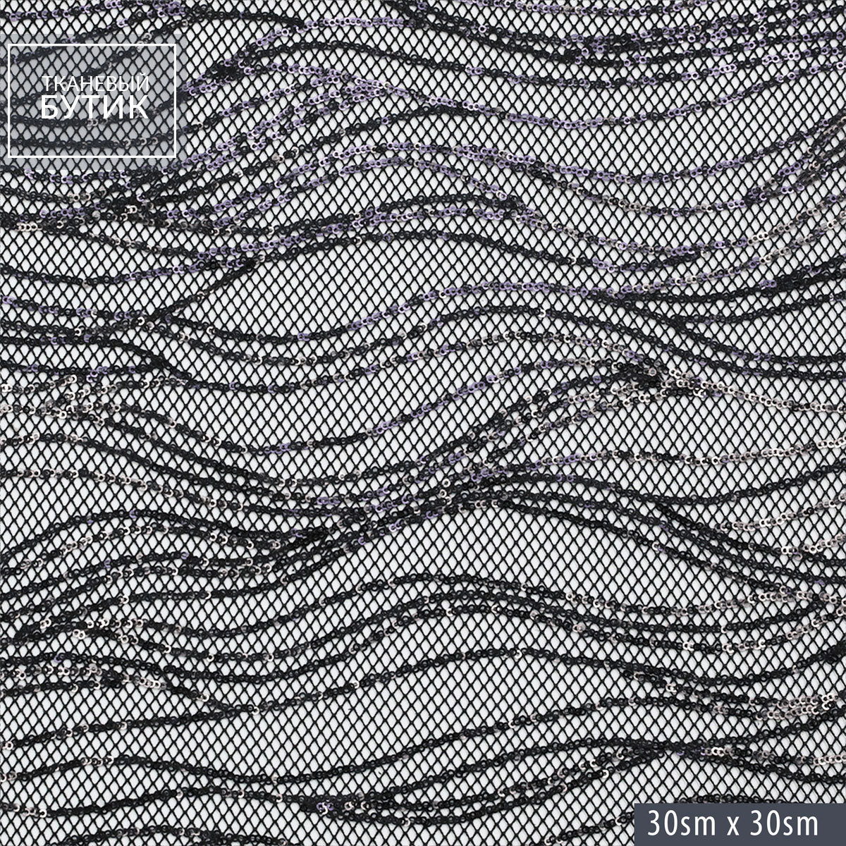 Вышивка линиями в виде волн черными, глянцевыми пайетками по сетке в тон с крупной, квадратной ячейкой. Ширина части с пайетками 1,3 м, плюс ширина кромки ок. 0,8 м (полная ширина полотна с кромками ок. 1,45 м). Состав — 100,00% PL. Рекомендуемый уход — стирка запрещена, не отбеливать, гладить при максимальной температуре подошвы утюга 110°C без пара (глажение с паром может вызывать необратимые повреждения), не применять барабанную сушку, профессиональная сухая чистка в обычном режиме.